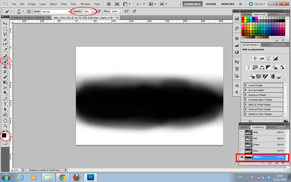 สีดำจะเป็นส่วนที่เราเลือกไว้ครับ ทีนี้จะเห็นว่าบางทีสีดำมันไม่สม่ำเสมอเราก็สามารถแก้ในขั้นตอนนี้ได้โดยการใช้ แปรงหัวนุ่มเหมือนเดิม แล้วตั้งให้ Foreground เป็นสีดำครับ Opacity 50% ระบายลงไปให้มันเรียบๆสม่ำๆ ตรงไหนที่เราคิดว่าอยากให้มันเบลอก็เปลี่ยนเป็นสีขาวแล้วระบายเพื่อลบออกครับ เมื่อเสร็จเรียบร้อยแล้วให้กดเปิด layer RGB (คลิกที่สี่เหลี่ยมหน้า layer RGB ครับ) แล้วกลับไปที่แถบ layer ทีนี้เราต้อง Copy layer Background โดยกด Ctrl+J แล้วตั้งชื่อ layer ใหม่เป็น Tilt-Shift blur เดี๋ยวเราจะทำให้มันเบลอครับ